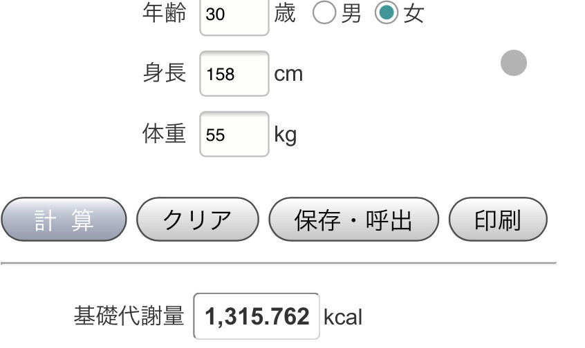 | 男性 | BMR = 66 + (13.7 × 体重(kg)) + (5 × 身長(cm)) – (6.8 × 年齢) |